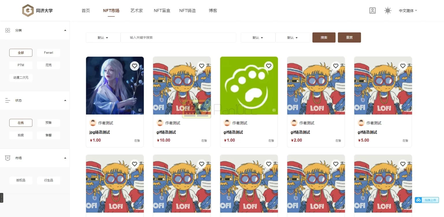 6.交易板块:展示所有商品、包含已售出、预售、销售中、拍卖中四个筛选页面;可模糊搜索,可通过筛选标签、筛选版权品与艺术品进行交易等;显示对应商品的缩略图(可上传商品的视频)、文字介绍、hash地址、NFT编号、发行数量、创造者钱包地址、价格等信息,发售中产品可点击进行购买